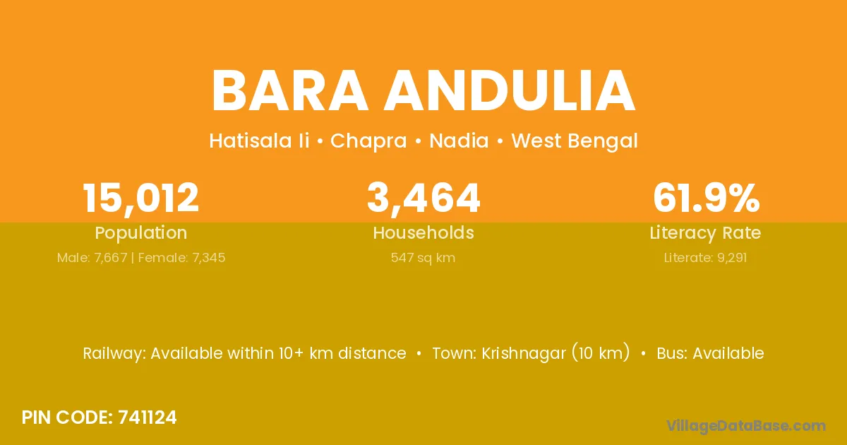 Krishnagar (10 km) is the nearest town to Bara Andulia village for major economic activities and is located approximately 10 km away.