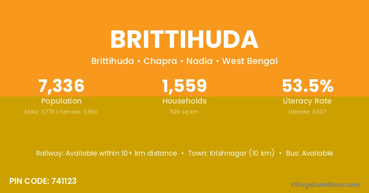 Brittihuda village is located in the Chapra Subdivision of the Nadia district in West Bengal.