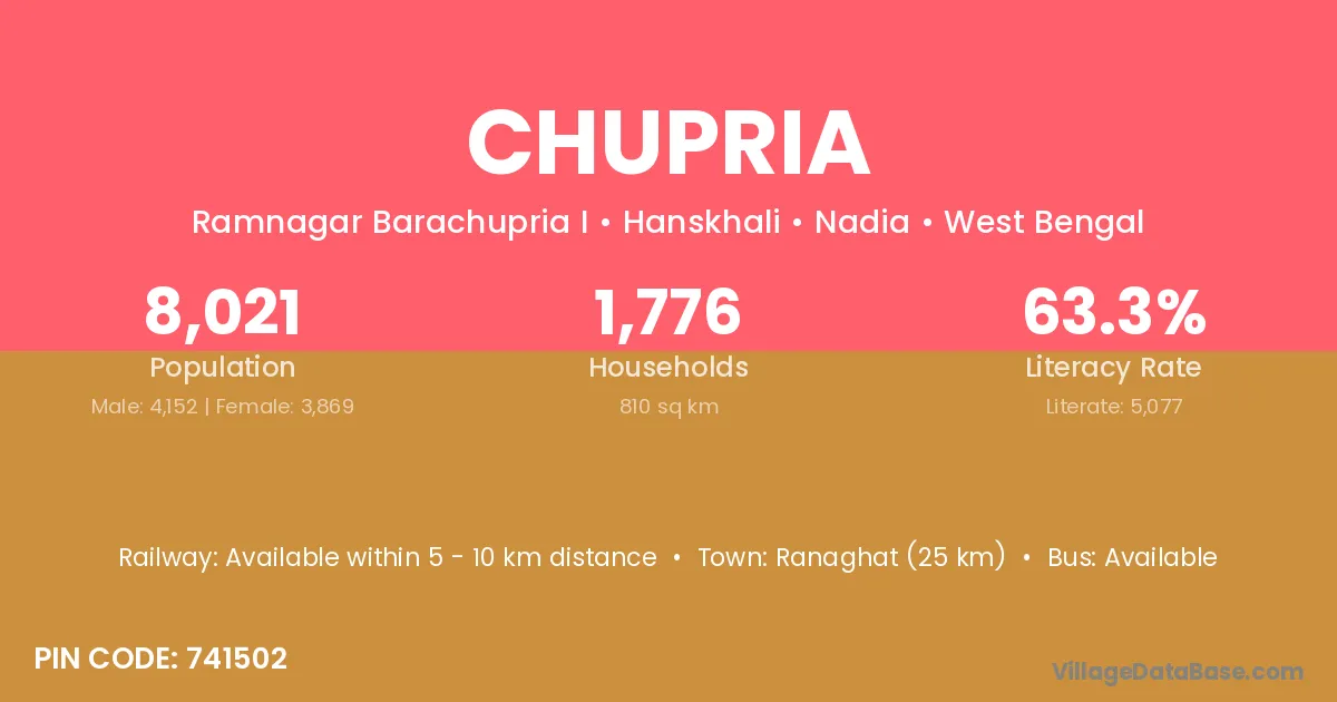 Ranaghat (25 km) is the nearest town to Chupria village for major economic activities and is located approximately 25 km away.