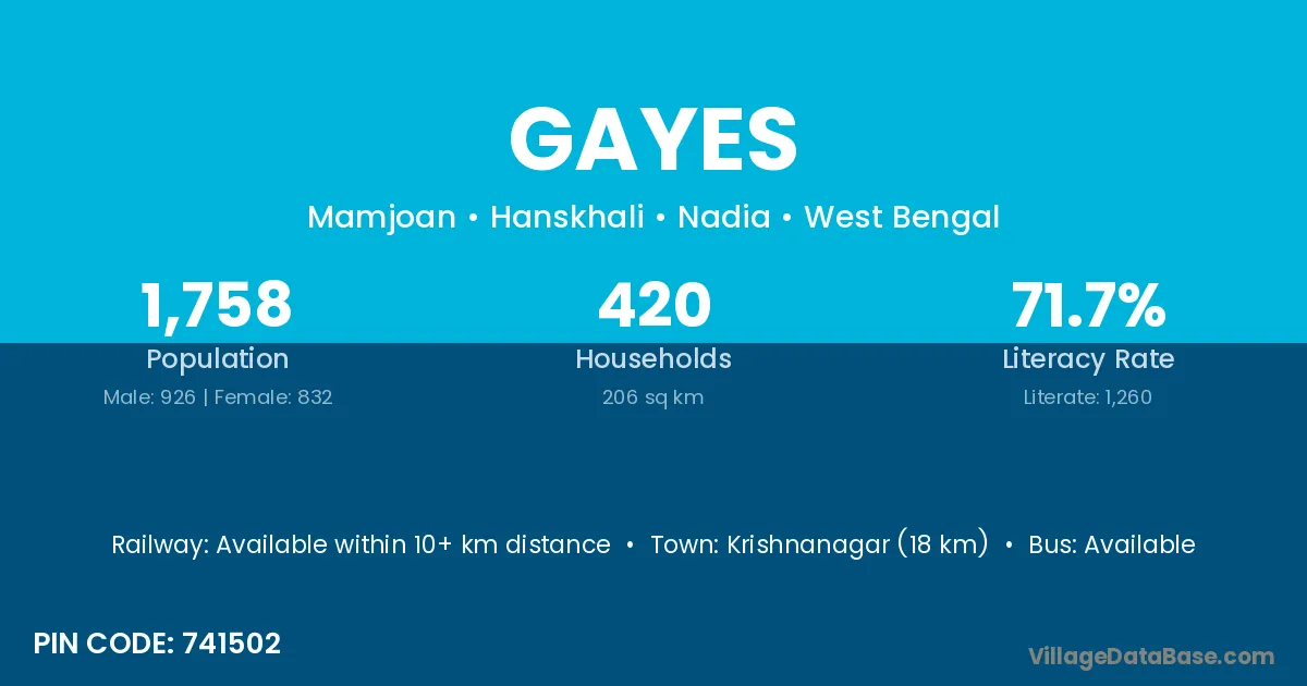 Krishnanagar (18 km) is the nearest town to Gayes village for major economic activities and is located approximately 18 km away.