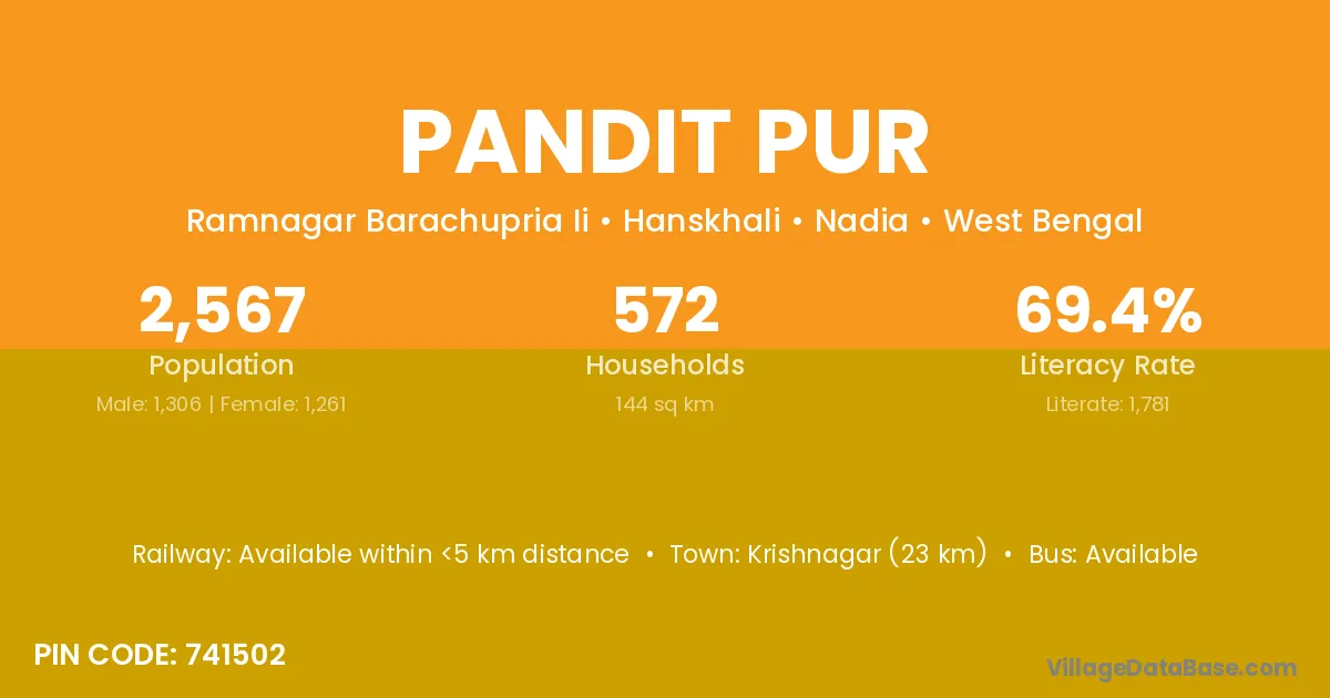 Krishnagar (23 km) is the nearest town to Pandit Pur village for major economic activities and is located approximately 23 km away.