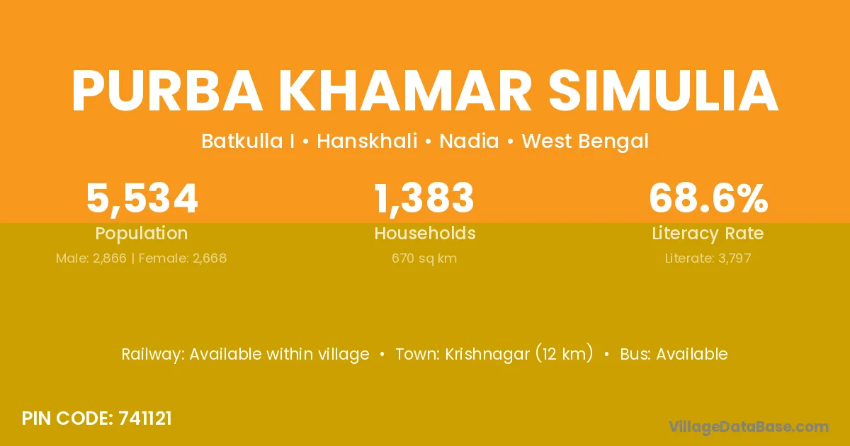 Purba Khamar Simulia village is located in the Hanskhali Subdivision of the Nadia district in West Bengal.