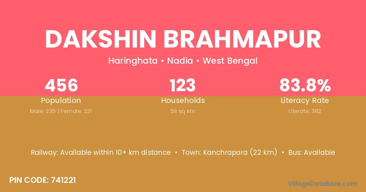 Dakshin Brahmapur village has a total population of 456 people, of which 235 are males and 221 are females.