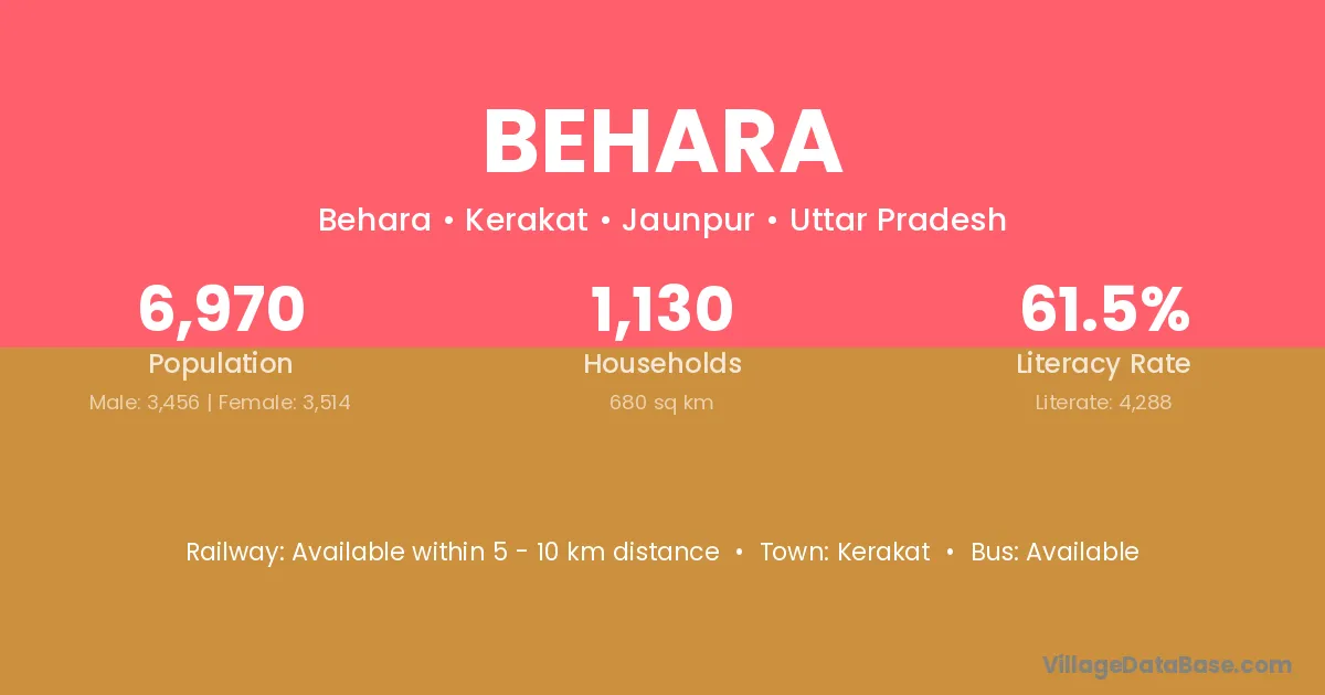The literacy rate of Behara village is 73.88%. Male literacy stands at 78.08% and female literacy at 69.44%.