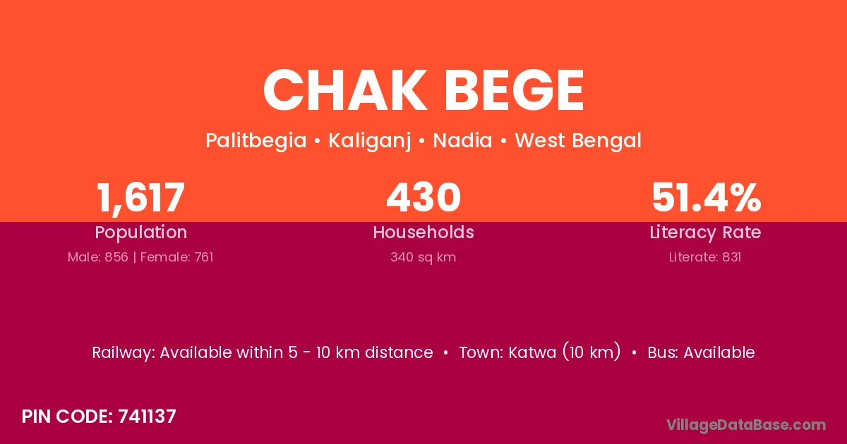 Katwa (10 km) is the nearest town to Chak Bege village for major economic activities and is located approximately 10 km away.