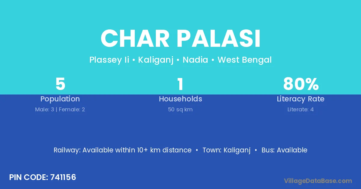 Char Palasi village has a total population of 5 people, of which 3 are males and 2 are females.