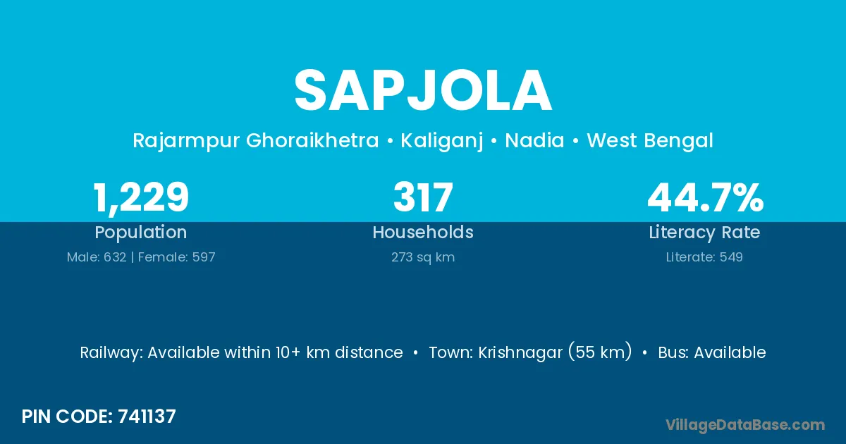 Krishnagar (55 km) is the nearest town to Sapjola village for major economic activities and is located approximately 55 km away.