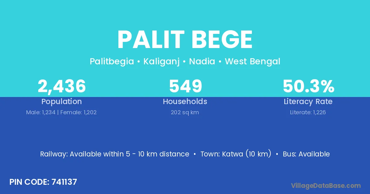Katwa (10 km) is the nearest town to Palit Bege village for major economic activities and is located approximately 10 km away.