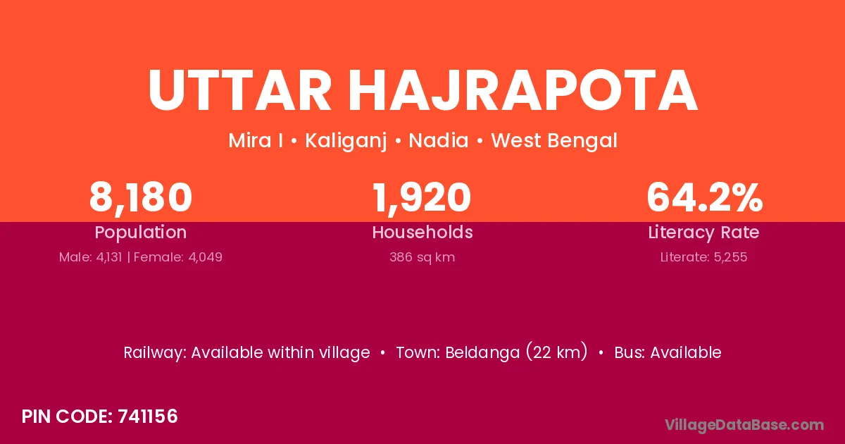 Beldanga (22 km) is the nearest town to Uttar Hajrapota village for major economic activities and is located approximately 22 km away.