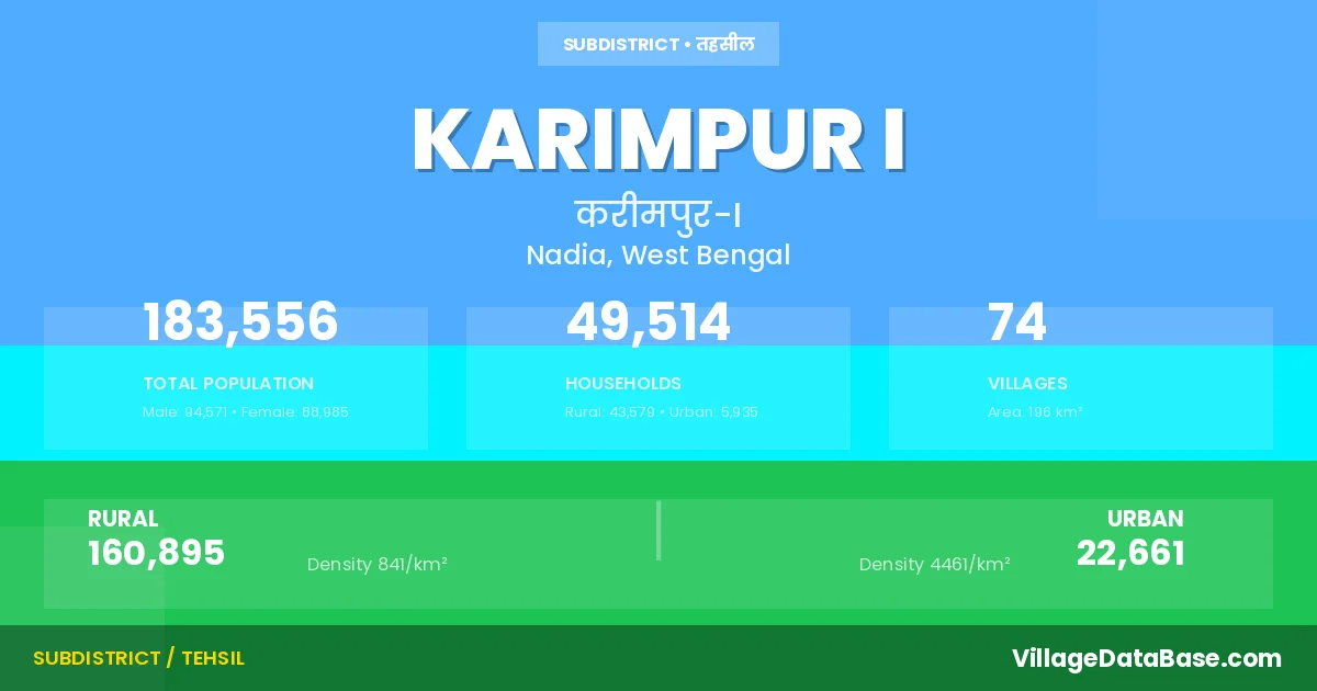 According to the 2011 census The total area of Karimpur I Subdivision is 196 km², with a population of 183556 people. The population density is 934 inhabitants per square kilometre, and there are approximately 49514 houses in the sub district.