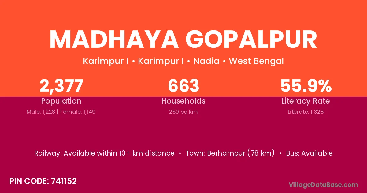 Madhaya Gopalpur village is located in the Karimpur I Subdivision of the Nadia district in West Bengal.