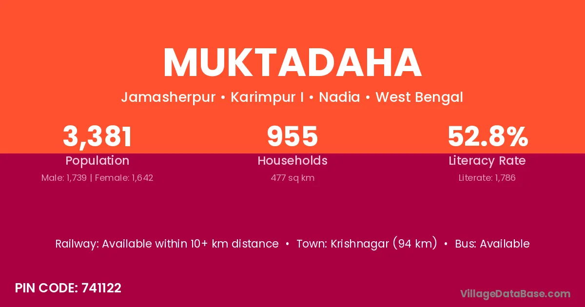 Krishnagar (94 km) is the nearest town to Muktadaha village for major economic activities and is located approximately 94 km away.