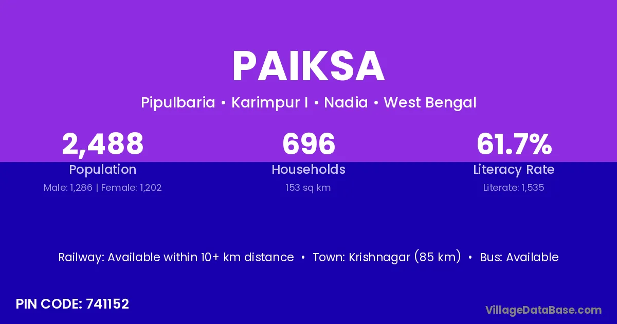 Krishnagar (85 km) is the nearest town to Paiksa village for major economic activities and is located approximately 85 km away.