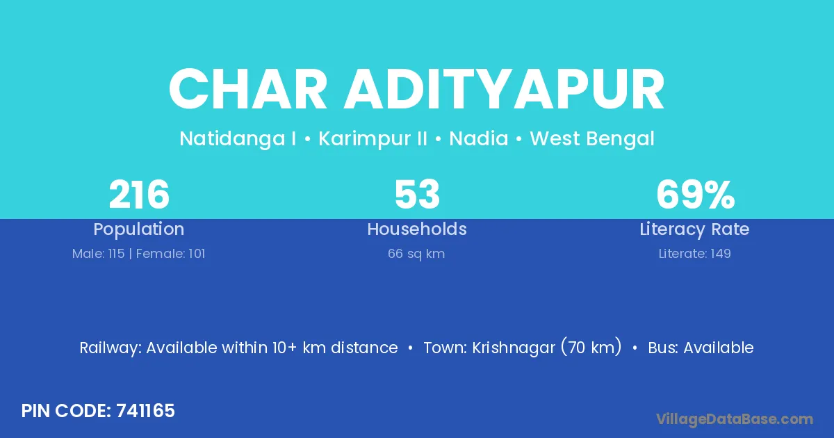 Krishnagar (70 km) is the nearest town to Char Adityapur village for major economic activities and is located approximately 70 km away.