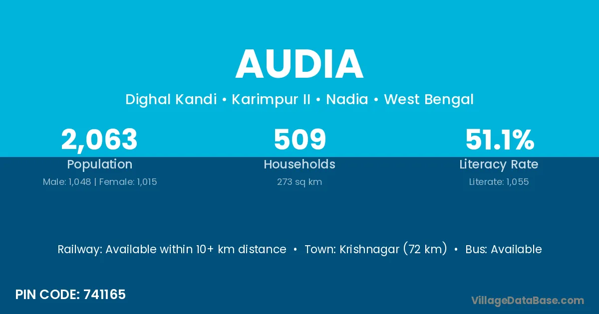 Krishnagar (72 km) is the nearest town to Audia village for major economic activities and is located approximately 72 km away.