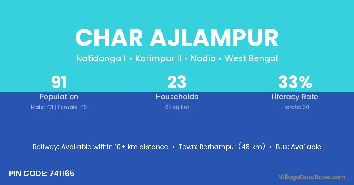 Berhampur (48 km) is the nearest town to Char Ajlampur village for major economic activities and is located approximately 48 km away.