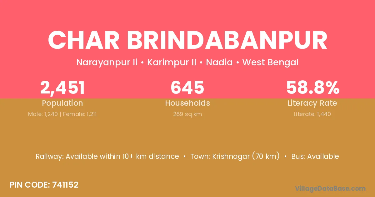 Char Brindabanpur village is located in the Karimpur II Subdivision of the Nadia district in West Bengal.