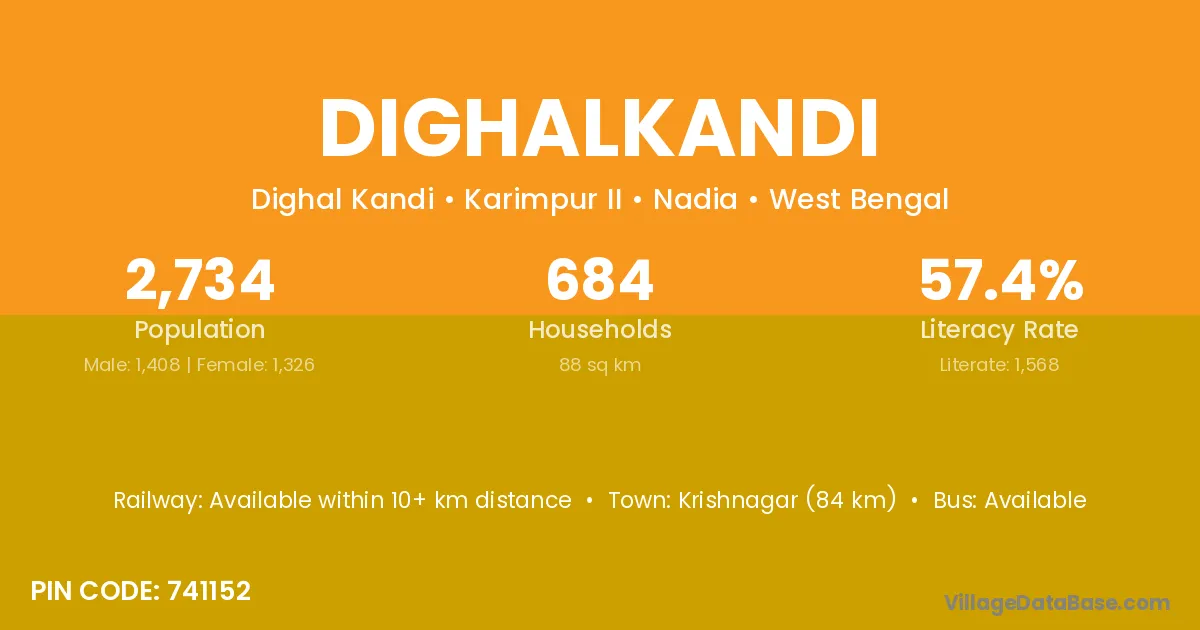 Krishnagar (84 km) is the nearest town to Dighalkandi village for major economic activities and is located approximately 84 km away.