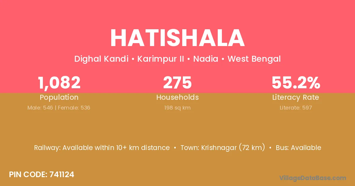 Krishnagar (72 km) is the nearest town to Hatishala village for major economic activities and is located approximately 72 km away.