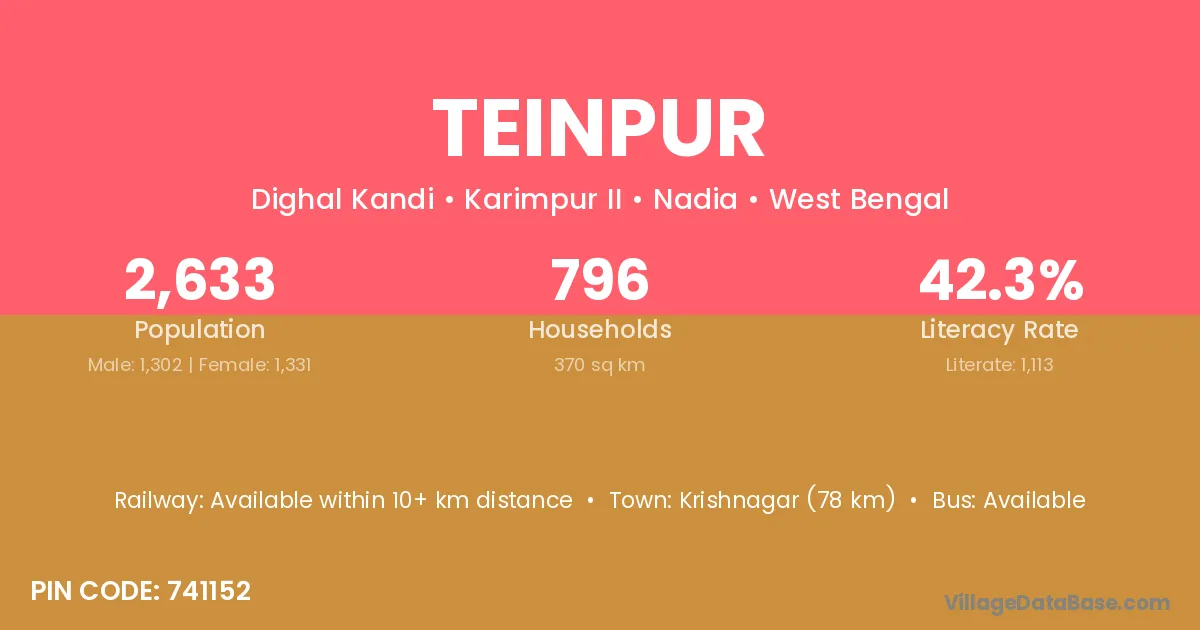 Krishnagar (78 km) is the nearest town to Teinpur village for major economic activities and is located approximately 78 km away.