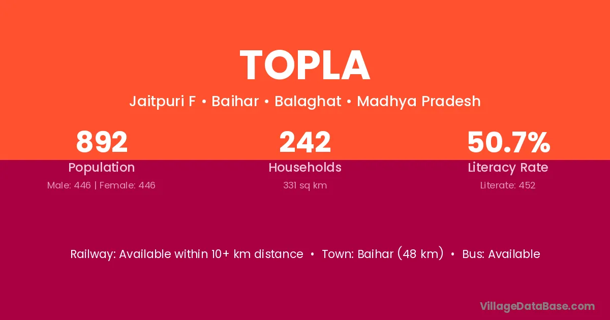 The literacy rate of Topla village is 52.20%. Male literacy stands at 52.59% and female literacy at 51.79%.
