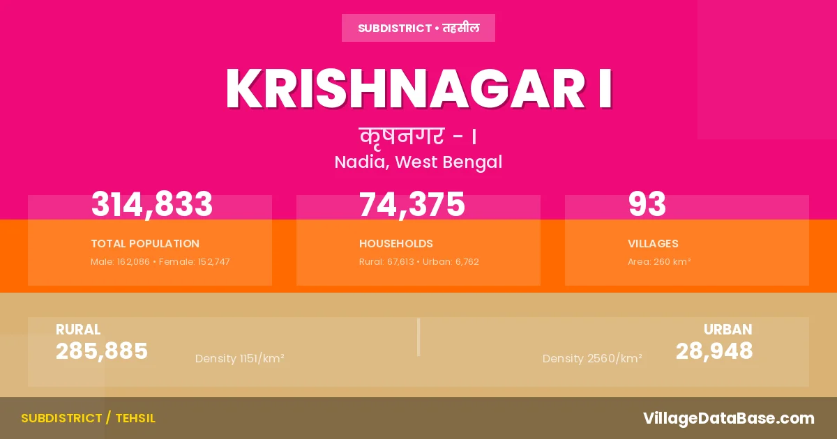 According to the 2011 census The total area of Krishnagar I Subdivision is 260 km², with a population of 314833 people. The population density is 1,212 inhabitants per square kilometre, and there are approximately 74375 houses in the sub district.