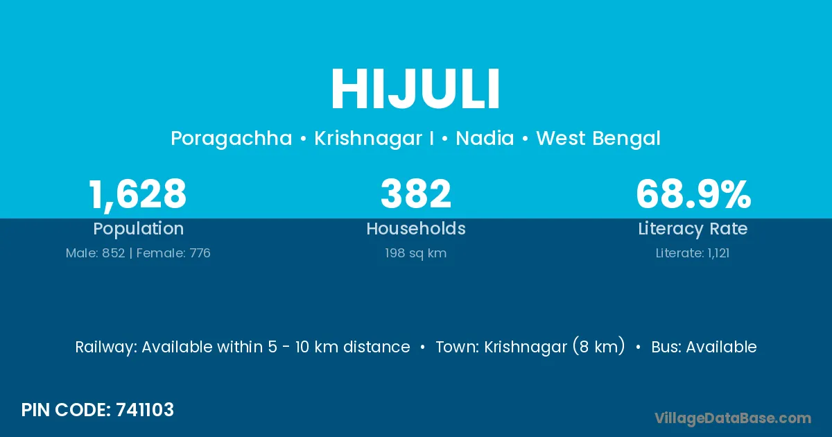 Krishnagar (8 km) is the nearest town to Hijuli village for major economic activities and is located approximately 8 km away.