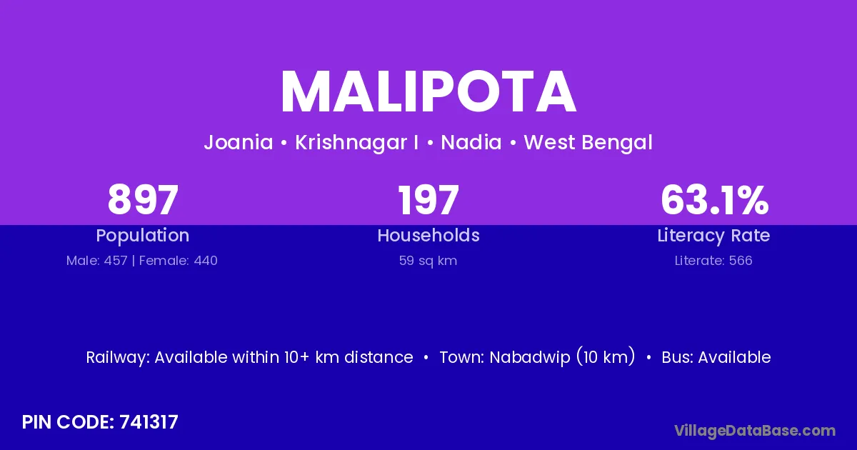 Nabadwip (10 km) is the nearest town to Malipota village for major economic activities and is located approximately 10 km away.