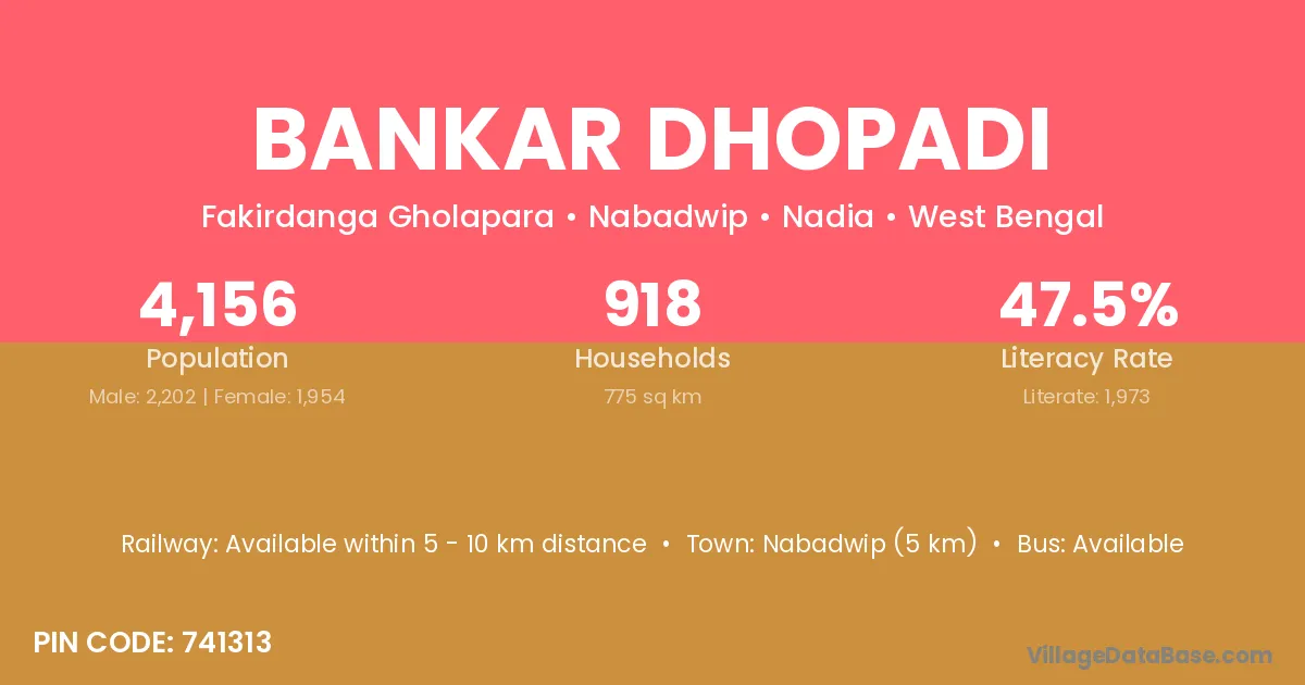 Nabadwip (5 km) is the nearest town to Bankar Dhopadi village for major economic activities and is located approximately 5 km away.