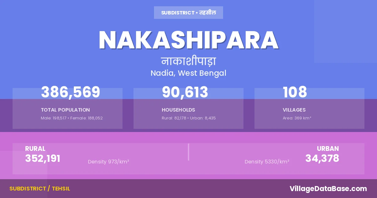 According to the 2011 census The total area of Nakashipara Subdivision is 369 km², with a population of 386569 people. The population density is 1,049 inhabitants per square kilometre, and there are approximately 90613 houses in the sub district.