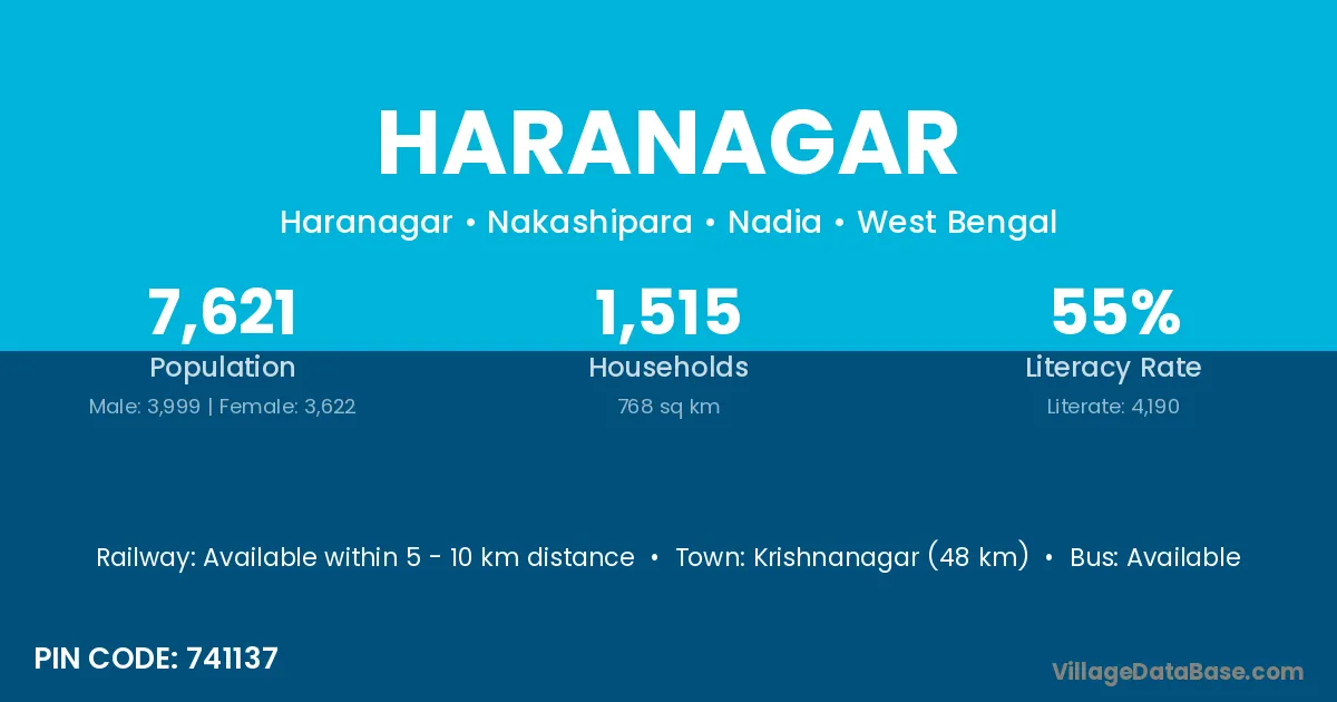 Krishnanagar (48 km) is the nearest town to Haranagar village for major economic activities and is located approximately 48 km away.