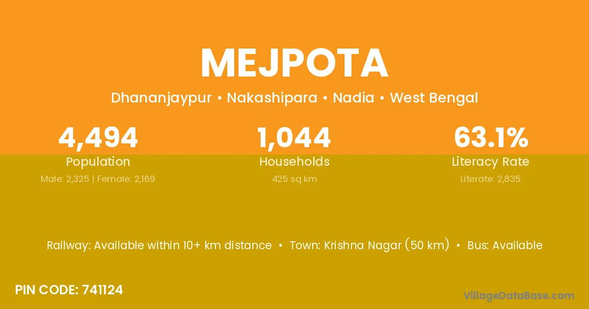 Krishna Nagar (50 km) is the nearest town to Mejpota village for major economic activities and is located approximately 50 km away.