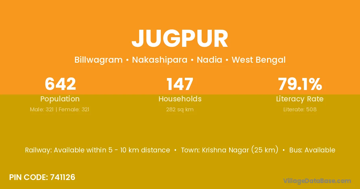 Krishna Nagar (25 km) is the nearest town to Jugpur village for major economic activities and is located approximately 25 km away.