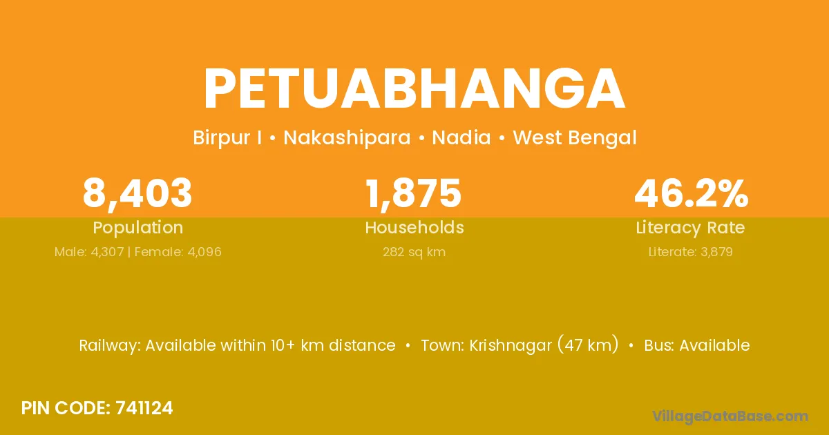 Krishnagar (47 km) is the nearest town to Petuabhanga village for major economic activities and is located approximately 47 km away.