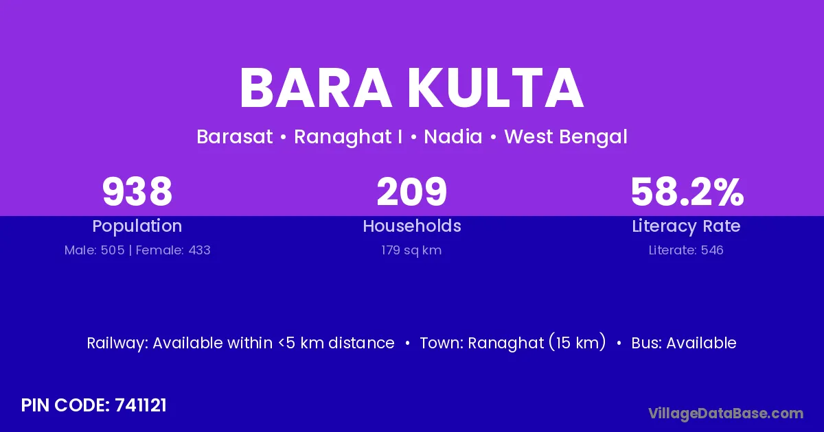 Ranaghat (15 km) is the nearest town to Bara Kulta village for major economic activities and is located approximately 15 km away.