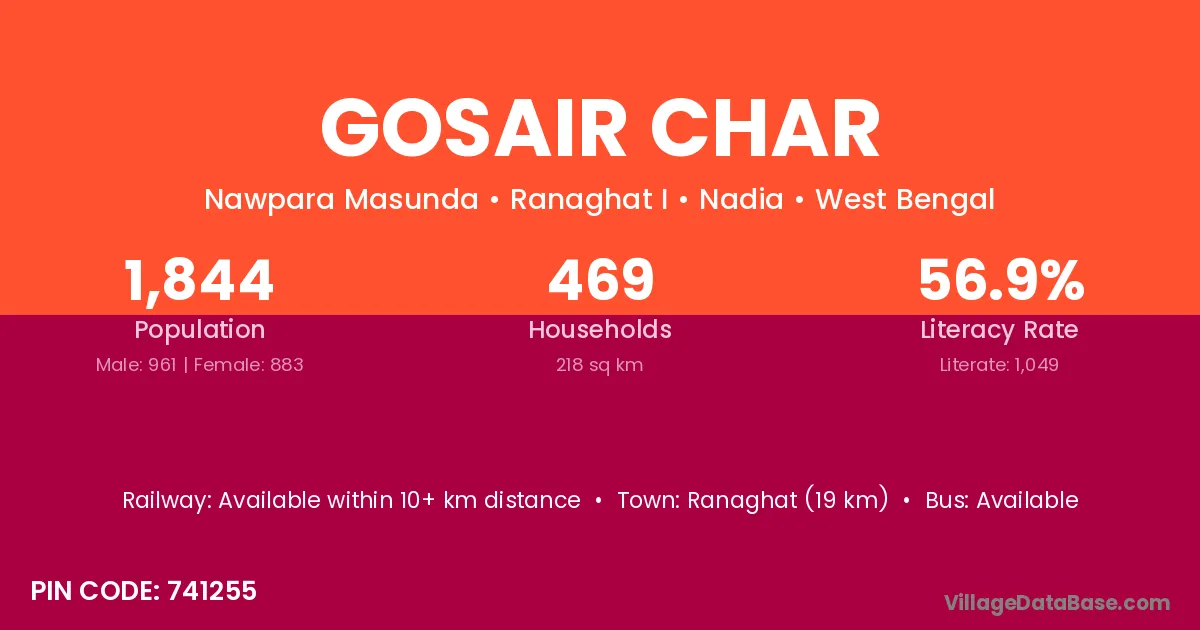 Ranaghat (19 km) is the nearest town to Gosair Char village for major economic activities and is located approximately 19 km away.