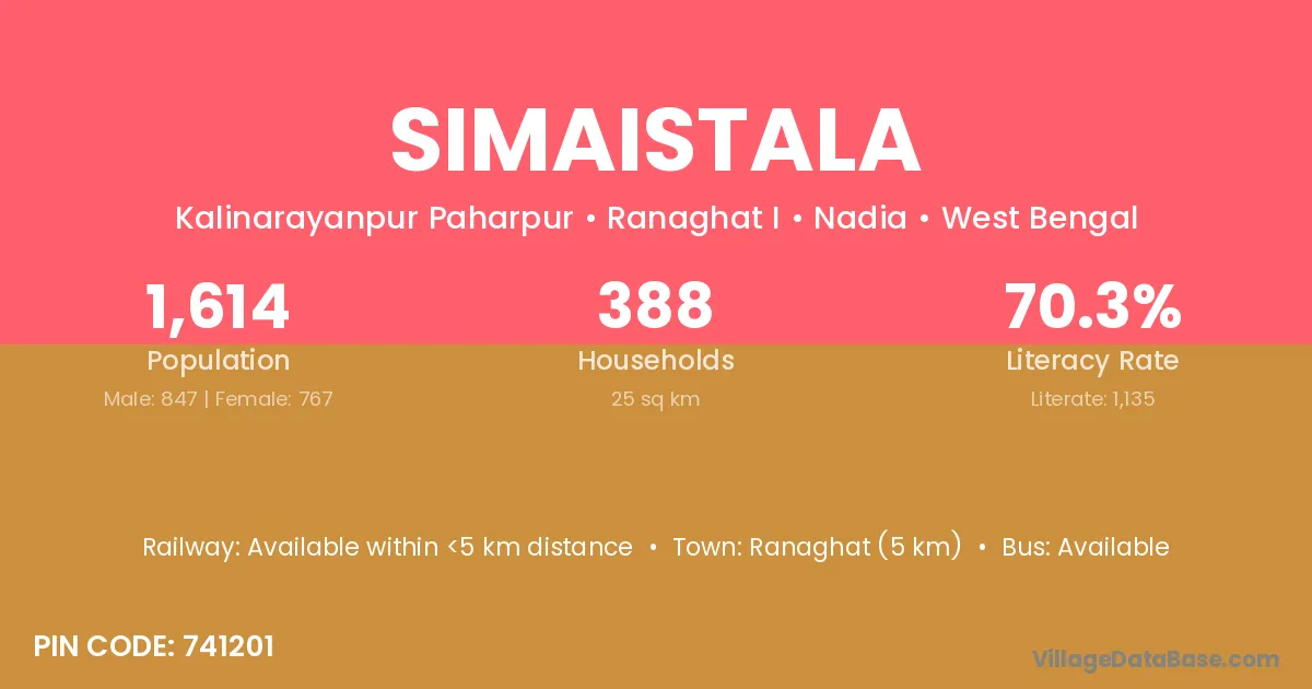 Ranaghat (5 km) is the nearest town to Simaistala village for major economic activities and is located approximately 5 km away.