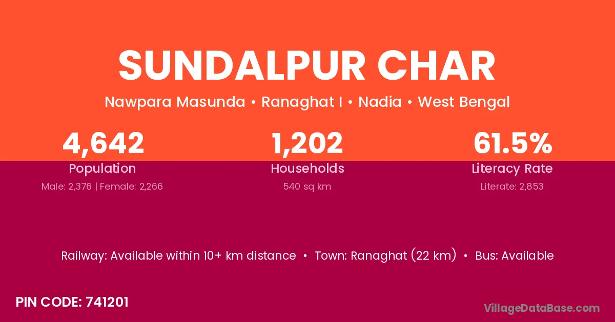 Ranaghat (22 km) is the nearest town to Sundalpur Char village for major economic activities and is located approximately 22 km away.