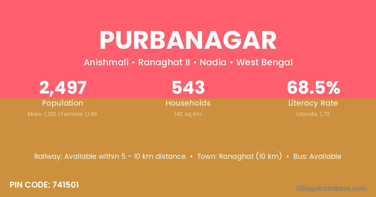 Ranaghat (10 km) is the nearest town to Purbanagar village for major economic activities and is located approximately 10 km away.