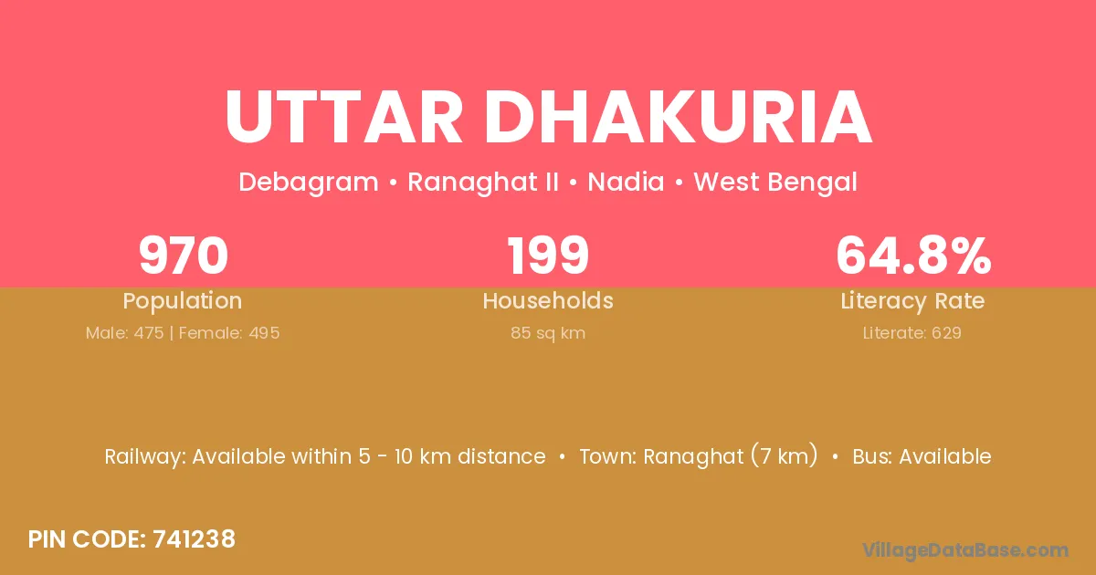 Ranaghat (7 km) is the nearest town to Uttar Dhakuria village for major economic activities and is located approximately 7 km away.