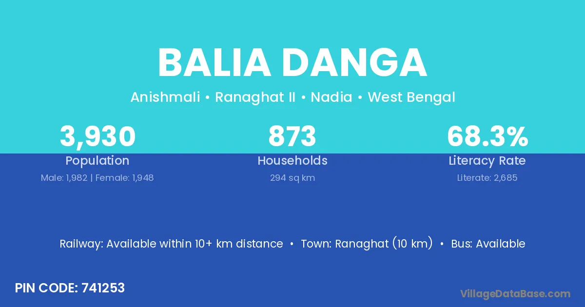 Ranaghat (10 km) is the nearest town to Balia Danga village for major economic activities and is located approximately 10 km away.