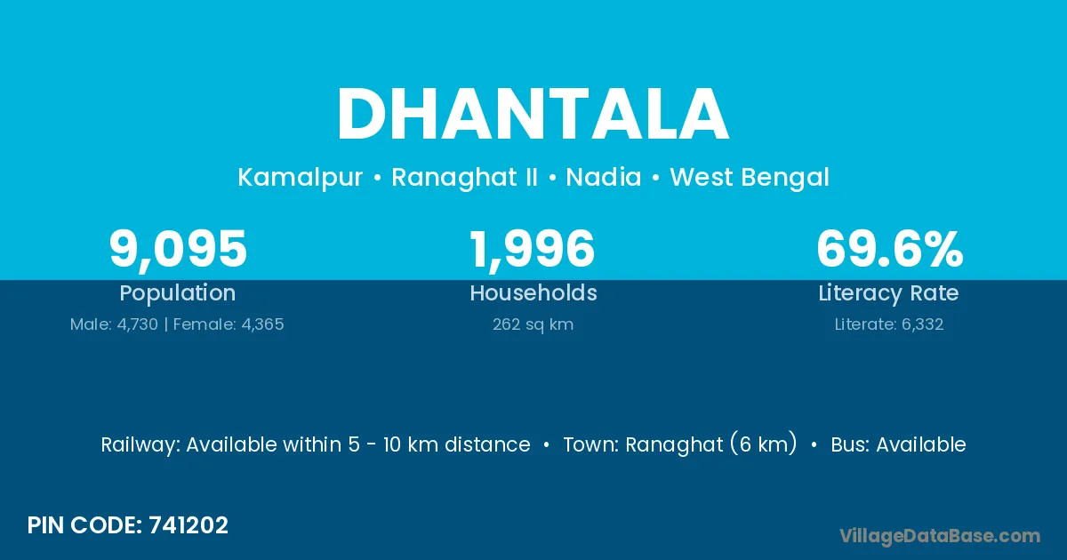 Ranaghat (6 km) is the nearest town to Dhantala village for major economic activities and is located approximately 6 km away.