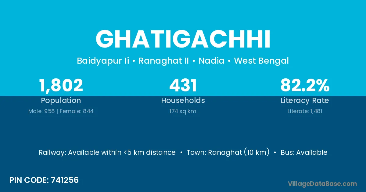 Ranaghat (10 km) is the nearest town to Ghatigachhi village for major economic activities and is located approximately 10 km away.