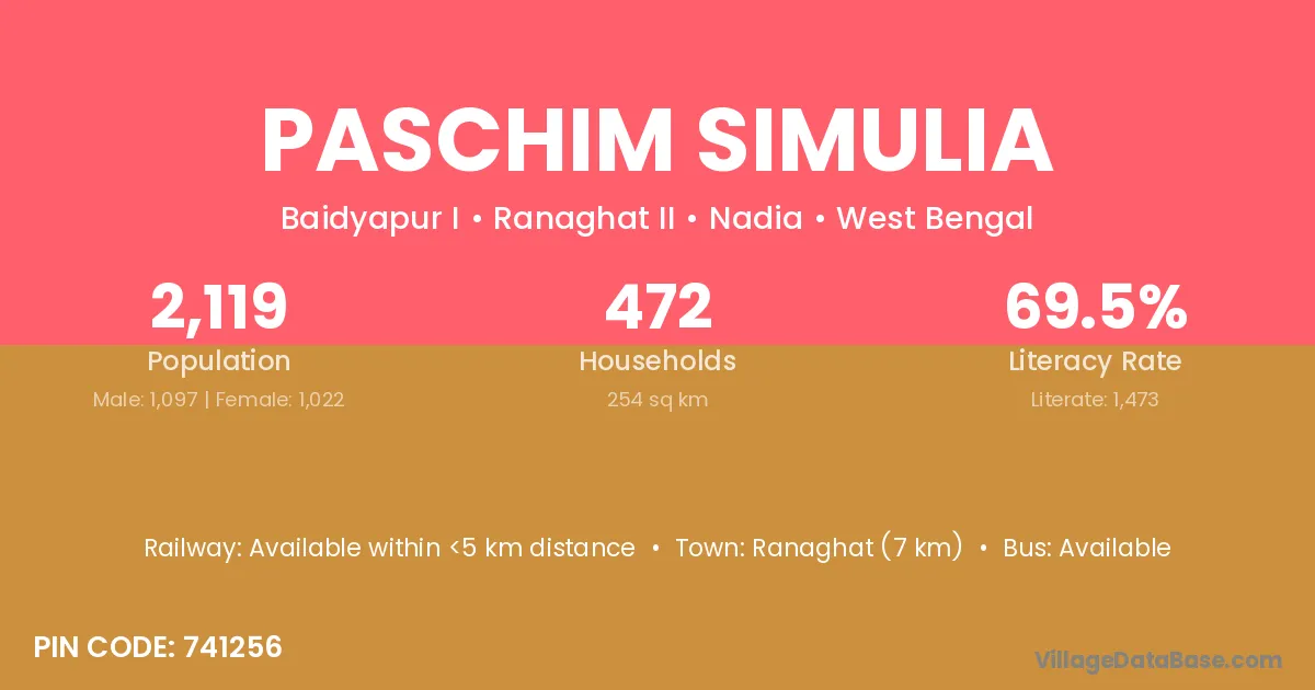 Paschim Simulia village is located in the Ranaghat II Subdivision of the Nadia district in West Bengal.