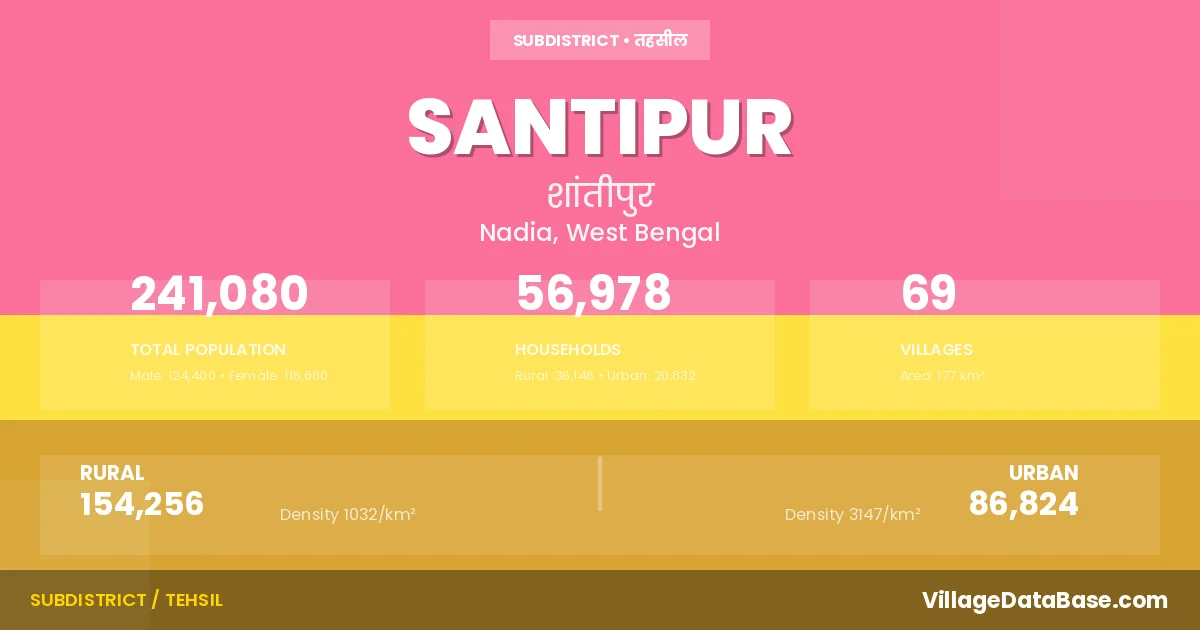According to the 2011 census The total area of Santipur Subdivision is 177 km², with a population of 241080 people. The population density is 1,361 inhabitants per square kilometre, and there are approximately 56978 houses in the sub district.