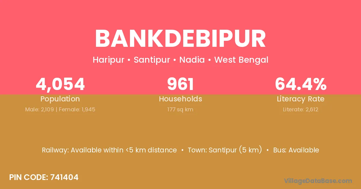 Santipur (5 km) is the nearest town to Bankdebipur village for major economic activities and is located approximately 5 km away.