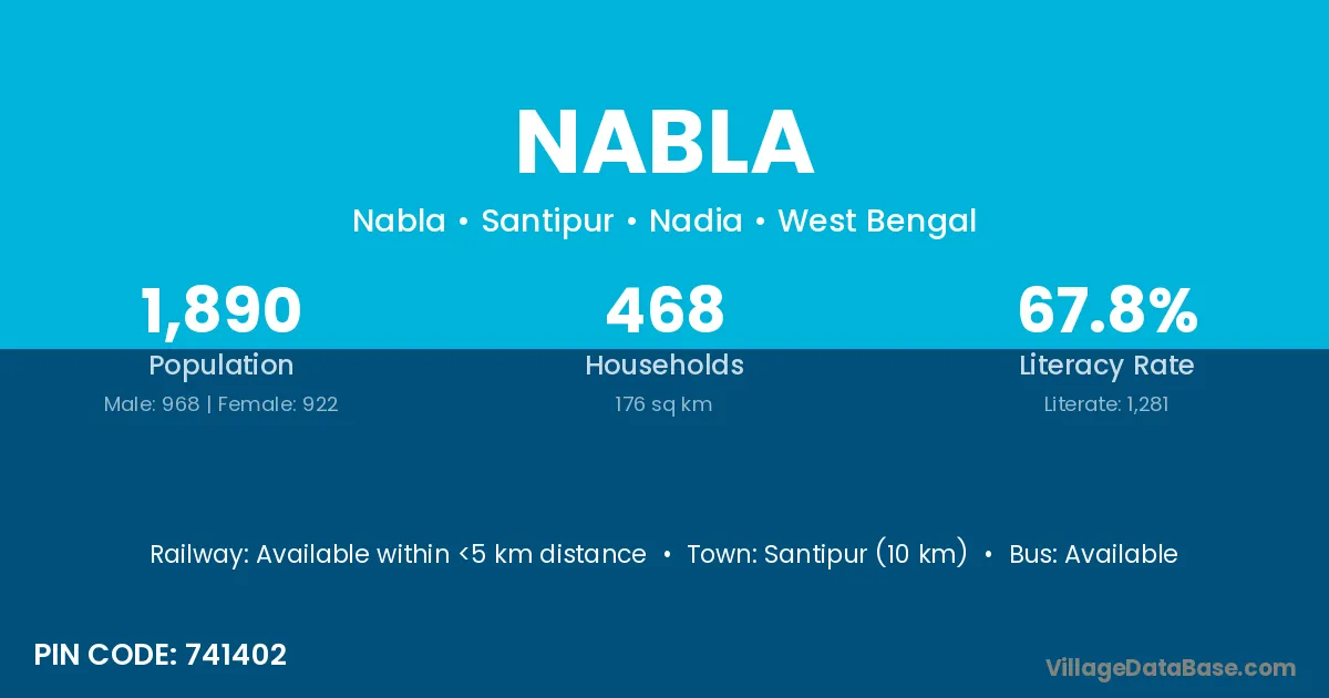 Santipur (10 km) is the nearest town to Nabla village for major economic activities and is located approximately 10 km away.