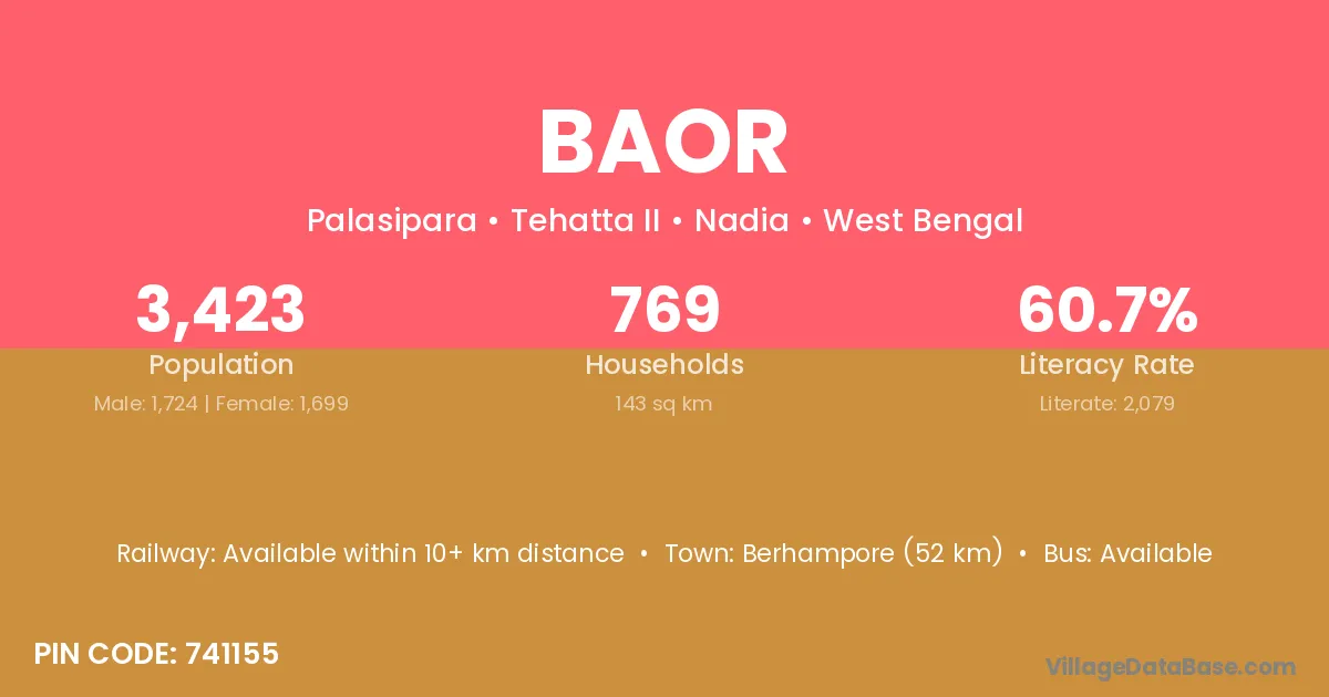 Berhampore (52 km) is the nearest town to Baor village for major economic activities and is located approximately 52 km away.