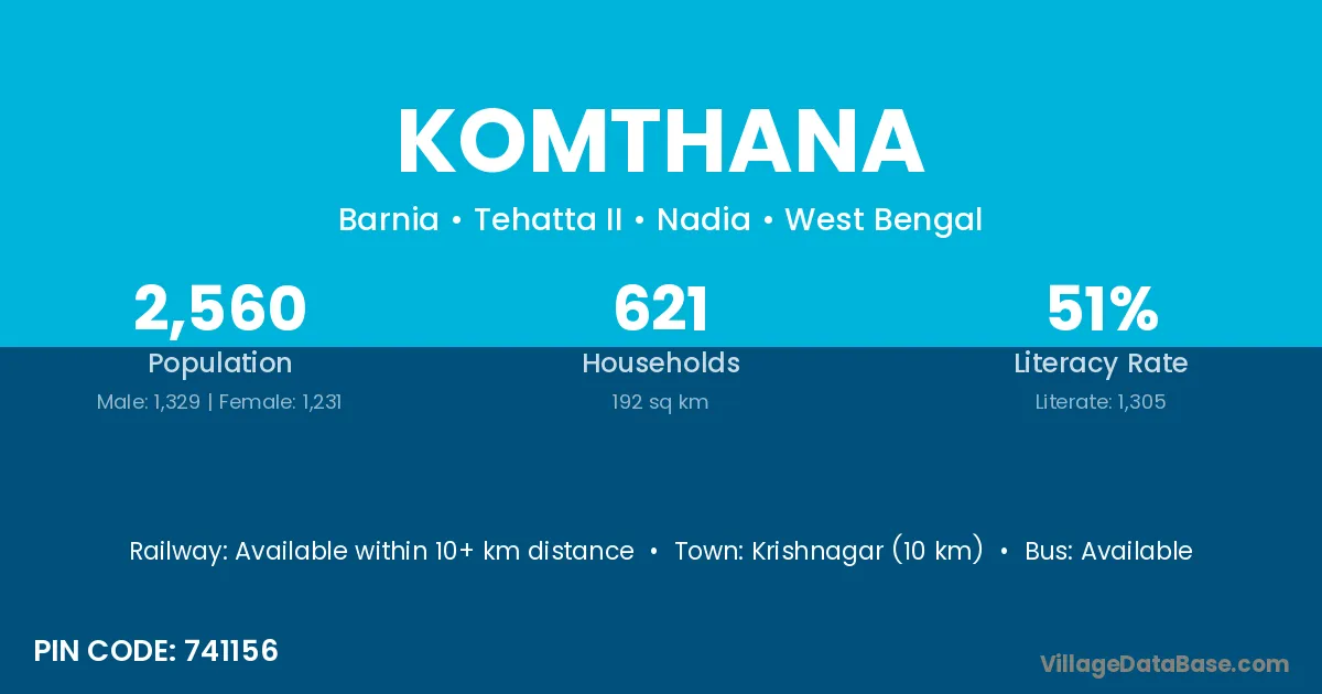 Krishnagar (10 km) is the nearest town to Komthana village for major economic activities and is located approximately 10 km away.