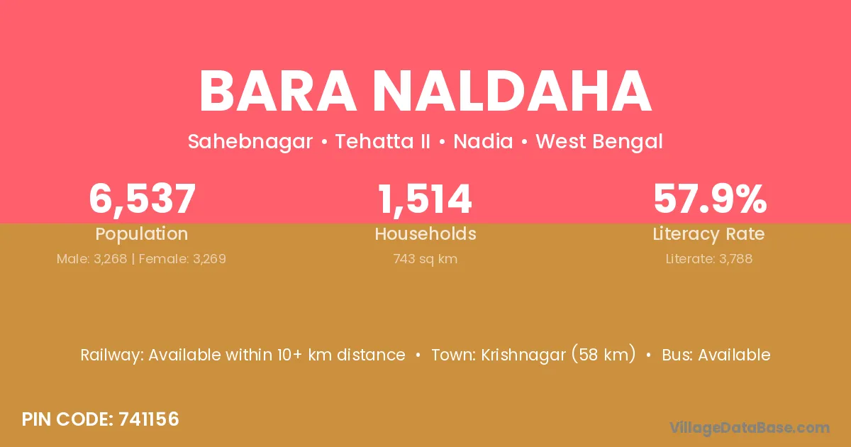 Krishnagar (58 km) is the nearest town to Bara Naldaha village for major economic activities and is located approximately 58 km away.